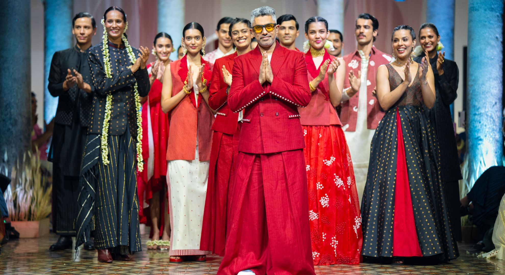 Vivek Karunakaran has never been interested in clothes for the sake of clothes. His work asks bigger questions about meaning, heritage, and identity. At the Chettinad Heritage Festival, he opened with Idam, a collection that reimagined the veshti, the sari, and Madras checks through a modern, gender-fluid lens. Red-and-white weaves, moody blacks, metallics, and sculptural jewellery came together in looks that felt like tradition with a wink.