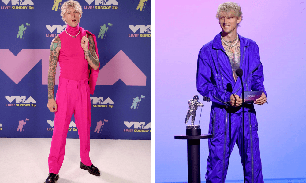 Machine Gun Kelly wore a head-to-toe pink ensemble by Berluti that incorporated a turtleneck tank and dress pants, a blazer thrown over his shoulder for MTV VMAs red carpet event. The rapper made a good choice with highlighter pink neon, nailing pink and neon in a single go.