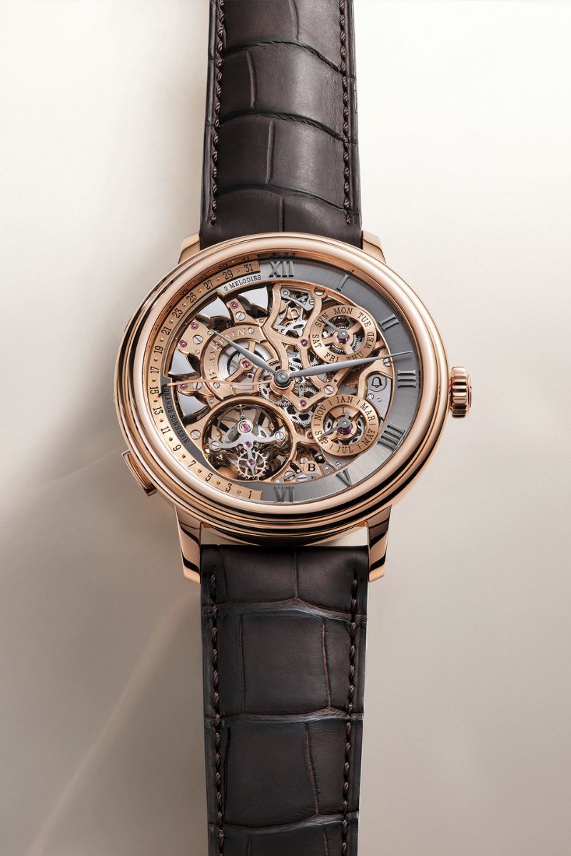 The Grande Sonnerie is also fitted with gold sounding rings, chosen after extensive research and material testing. While various alloys were evaluated, gold consistently produced the most refined and balanced acoustic performance. Its presence here is not a gesture of opulence, but the outcome of methodical experimentation and an uncompromising pursuit of perfect sound. In total, the movement features 26 bridges, each crafted in 18 ct gold. The Grande Double Sonnerie also included traditional hand finish of anglage (135 inward angles), perlage, mirror polishing, diamond milling, and straight graining, in Blancpain's finishing workshop in Le Brassus.